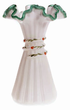 Milk Glass HP Wheat Vase. Handpainted around the middle with red apples and green leaves for a holiday or country look. Has a Emerald Green crest with a double crimp. Measures approx. 8"H.