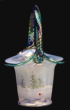 French Opalescent Iridized HP Basket. Decorated with the Woodland Frost decoration designed by Robin Spindler that depicts a red Cardinal standing in a snow covered tree scene. Has a iridized Emerald Green crest and rib twisted handle. Limited Edition of 300 pieces and was a QVC.com exclusive. Measures approx. 7"H.